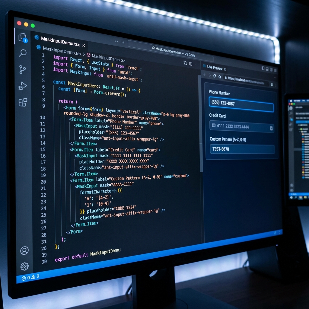 When building forms in React applications, developers often need to format user input in real-time - phone numbers, credit cards, dates, and custom patterns. While IMask.js is a powerful masking library, integrating it with modern React component libraries like Ant Design requires careful handling of refs, state management, and TypeScript types.