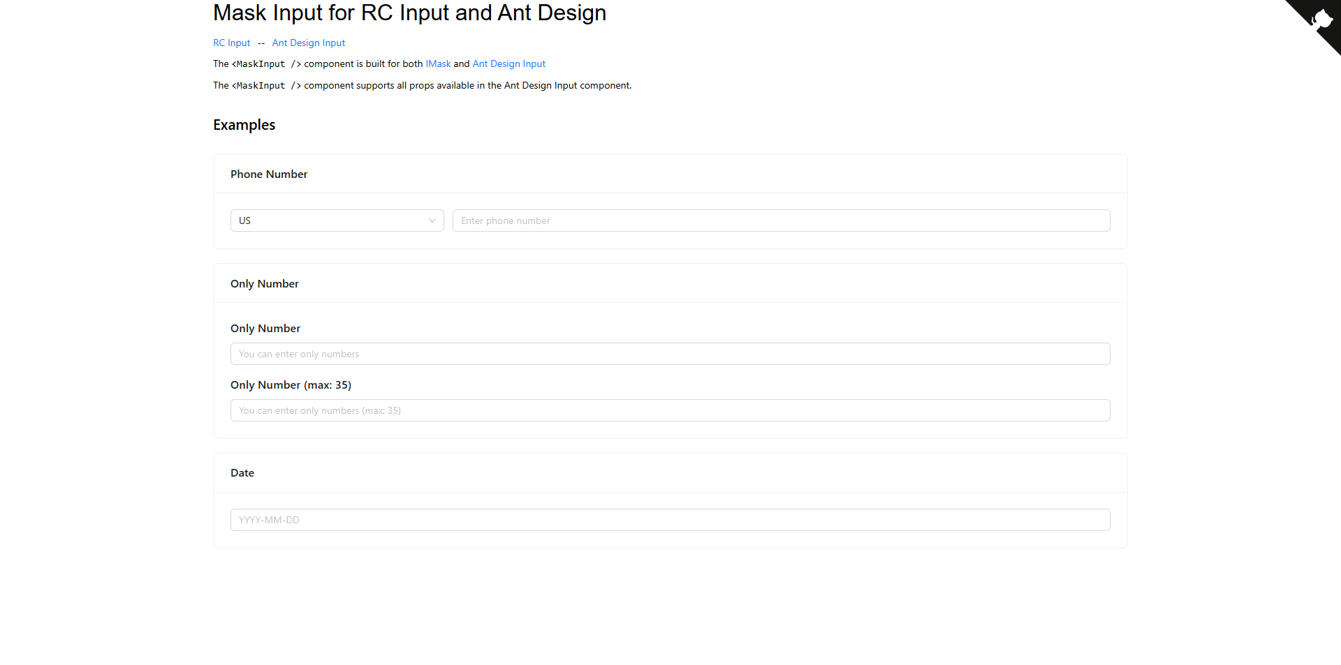 Mask-Input bridges this gap by providing ready-to-use React components that wrap IMask.js functionality with full TypeScript support. The library offers two main components: InputMask for HTML Input and AntdInputMask for Ant Design/RC Input, both supporting all native input props while adding powerful masking capabilities.
